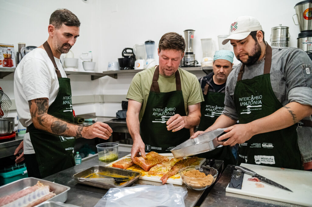 Os chefs dinamarqueses Bo Frederiksen e Marc Bach Reihs somaram-se ao grupo, contribuindo com novas perspectivas e aprendendo com os saberes tradicionais das comunidades amazônicas.