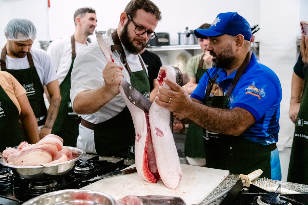 Além disso, ao lado do chef Paulo Anijar, Cleuder falou sobre a valorização de espécies de peixes menos comerciais, reforçando a importância de ampliar o olhar para além dos mais conhecidos e explorados pelo mercado. A dupla destacou que a Amazônia abriga uma enorme variedade de espécies com excelente potencial gastronômico, mas que ainda são pouco consumidas. “É o caso da piaba que tem um preço em conta, o tamuatá, o aracu e um peixe de lago chamado cachorro do padre ou anujá, que é muito gostoso”, disse.